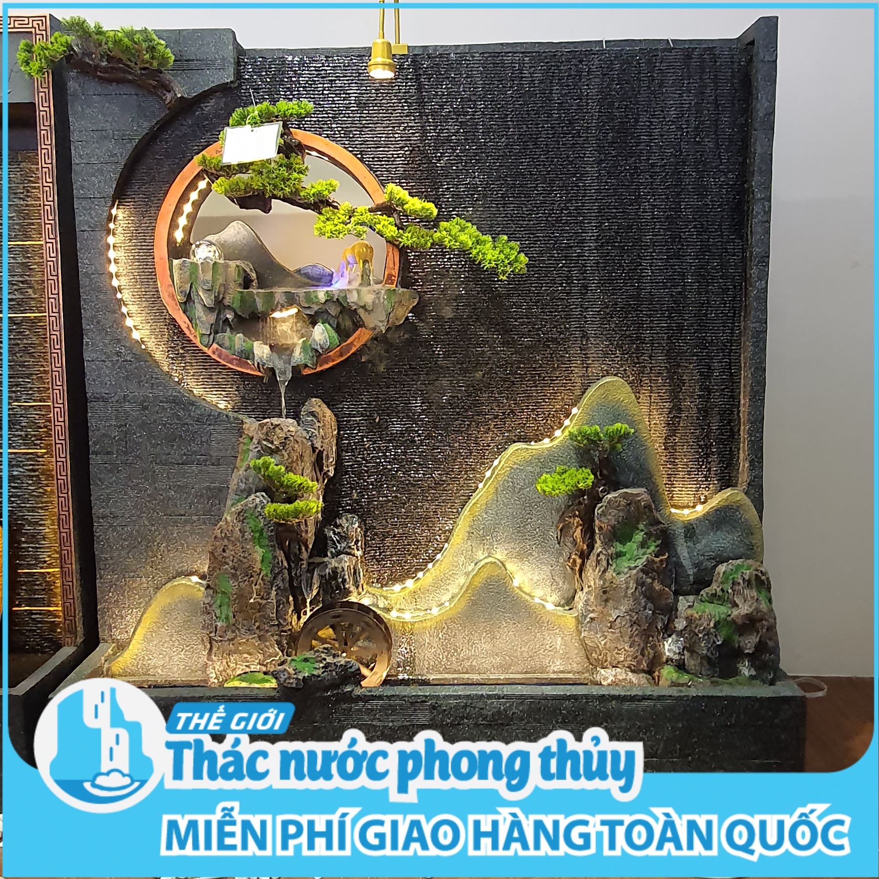 Vách thác nước phong thủy tiểu cảnh trong nhà TN03-327 có kích thước lên đến 1m8 chiều ngang và 1m78 chiều cao. Là model lớn nhất nhưng TN03-327 lại thể hiện với một phong cách tĩnh lạ lùng. Phần giữa như một bức tranh thủy mặc cực đẹp với 1 cành tùng vươn ngang phía dưới điểm xuyến bằng 3 ngọn núi cao dần theo thế Thái Sơn. Một vòng tròn lớn ở giữa khiến ta liên tưởng đến những “Cổng Rồng” trên những tòa nhà cao tầng tại Hồng Kong vừa mang một nét thiền vô cùng nhẹ nhàng. Nước chảy nhẹ từ hai vách trang trí hai bên xuống khu vực trồng cây. TN03-327 là mẫu thác nước hiếm hoi cho ta nhiều không gian để sắp đặt các loại cây thật và sỏi trắng hoặc sỏi màu phía trên một nền tối theo lối tối giản.