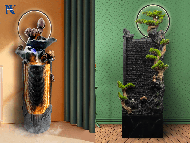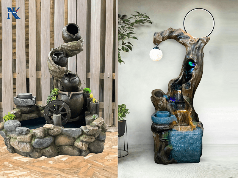 - Chất liệu: Thác nước phong cách đá hoặc màu vàng đất.