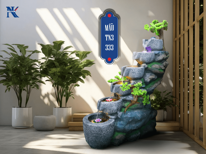 - Trang trí bên trong: Thêm cây xanh, đèn LED hoặc đá trang trí để thác nước thêm sinh động.